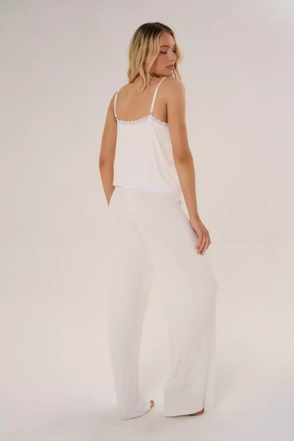 El top lencero destaca por su escote en V y breteles regulables, permitiendo un ajuste personalizado. Su diseño delicado incorpora una abertura central en el delantero y detalles de puntilla al tono, aportando un toque de sofisticación y femineidad.